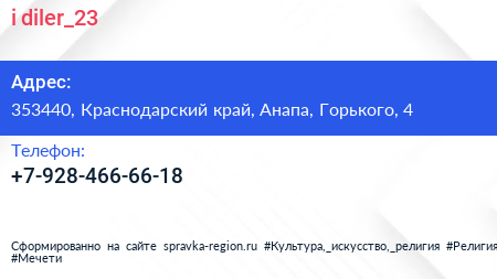 i.diler_23 по адресу 353440, Краснодарский край, Анапа, Горького, 4 в дальнейшем Организация, размещена в следующих категориях: