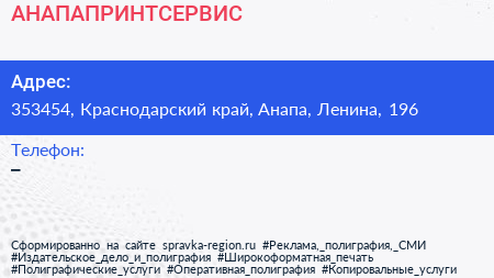 АНАПАПРИНТСЕРВИС по адресу 353454, Краснодарский край, Анапа, Ленина, 196 в дальнейшем Организация, размещена в следующих категориях: