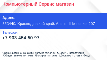 Компьютерный Сервис, магазин по адресу 353440, Краснодарский край, Анапа, Шевченко, 207 в дальнейшем Организация, размещена в следующих категориях: