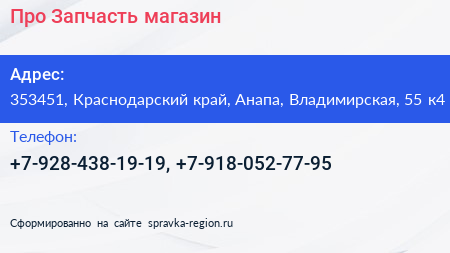 Про Запчасть, магазин по адресу 353451, Краснодарский край, Анапа, Владимирская, 55 к4 в дальнейшем Организация, размещена в следующих категориях: