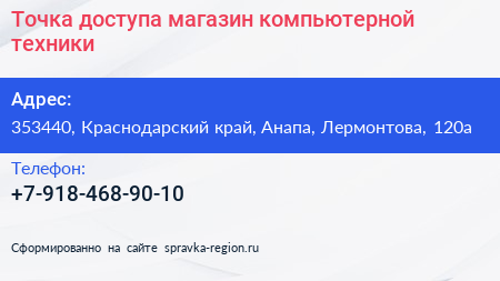 Точка доступа, магазин компьютерной техники по адресу 353440, Краснодарский край, Анапа, Лермонтова, 120а в дальнейшем Организация, размещена в следующих категориях: