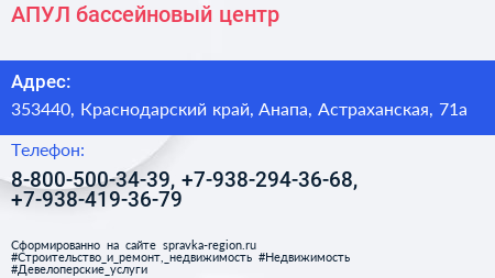 АПУЛ, бассейновый центр по адресу 353440, Краснодарский край, Анапа, Астраханская, 71а в дальнейшем Организация, размещена в следующих категориях:
