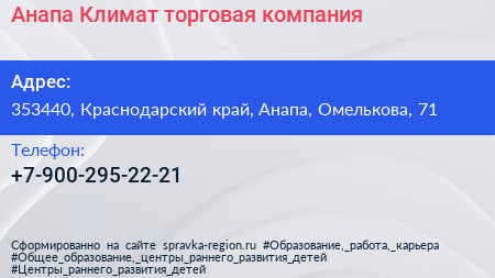 Анапа-Климат, торговая компания по адресу 353440, Краснодарский край, Анапа, Омелькова, 71 в дальнейшем Организация, размещена в следующих категориях: