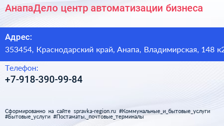 АнапаДело, центр автоматизации бизнеса по адресу 353454, Краснодарский край, Анапа, Владимирская, 148 к2 в дальнейшем Организация, размещена в следующих категориях: