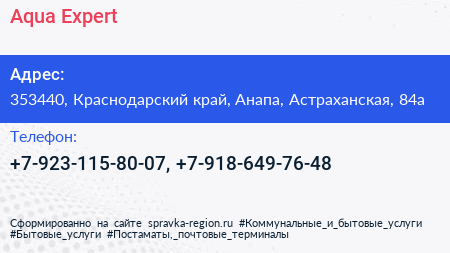 Aqua-Expert по адресу 353440, Краснодарский край, Анапа, Астраханская, 84а в дальнейшем Организация, размещена в следующих категориях: