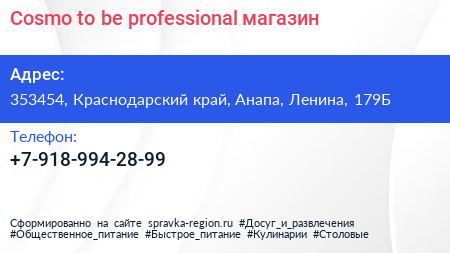 Cosmo to be professional, магазин по адресу 353454, Краснодарский край, Анапа, Ленина, 179Б в дальнейшем Организация, размещена в следующих категориях: