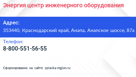 Энергия, центр инженерного оборудования по адресу 353440, Краснодарский край, Анапа, Анапское шоссе, 87а в дальнейшем Организация, размещена в следующих категориях:
