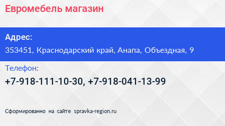 Евромебель, магазин по адресу 353451, Краснодарский край, Анапа, Объездная, 9 в дальнейшем Организация, размещена в следующих категориях: