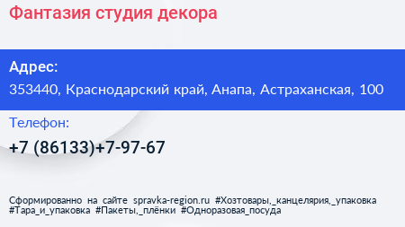 Фантазия, студия декора по адресу 353440, Краснодарский край, Анапа, Астраханская, 100 в дальнейшем Организация, размещена в следующих категориях: