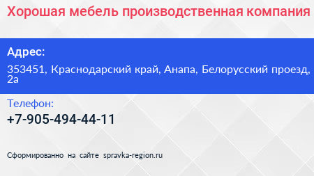 Хорошая мебель, производственная компания по адресу 353451, Краснодарский край, Анапа, Белорусский проезд, 2а в дальнейшем Организация, размещена в следующих категориях: