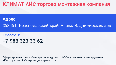 КЛИМАТ АЙС, торгово-монтажная компания по адресу 353451, Краснодарский край, Анапа, Владимирская, 55в в дальнейшем Организация, размещена в следующих категориях: