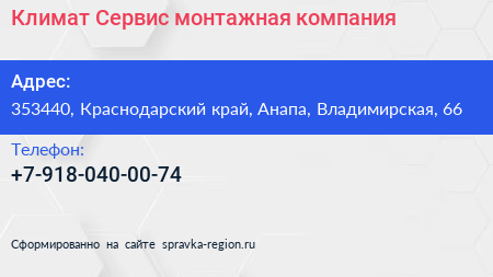 Климат-Сервис, монтажная компания по адресу 353440, Краснодарский край, Анапа, Владимирская, 66 в дальнейшем Организация, размещена в следующих категориях:
