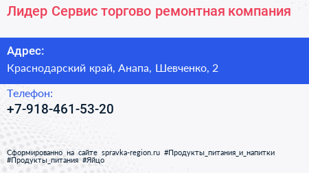Лидер Сервис, торгово-ремонтная компания по адресу Краснодарский край, Анапа, Шевченко, 2 в дальнейшем Организация, размещена в следующих категориях: