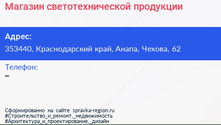 Магазин светотехнической продукции по адресу 353440, Краснодарский край, Анапа, Чехова, 62 в дальнейшем Организация, размещена в следующих категориях: