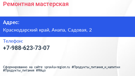 Ремонтная мастерская по адресу Краснодарский край, Анапа, Садовая, 2 в дальнейшем Организация, размещена в следующих категориях: