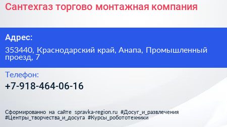 Сантехгаз, торгово-монтажная компания по адресу 353440, Краснодарский край, Анапа, Промышленный проезд, 7 в дальнейшем Организация, размещена в следующих категориях:
