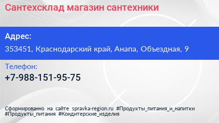 Сантехсклад, магазин сантехники по адресу 353451, Краснодарский край, Анапа, Объездная, 9 в дальнейшем Организация, размещена в следующих категориях: