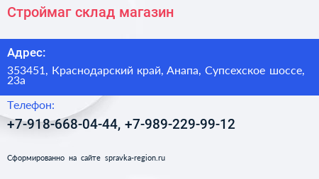 Строймаг, склад-магазин по адресу 353451, Краснодарский край, Анапа, Супсехское шоссе, 23а в дальнейшем Организация, размещена в следующих категориях:
