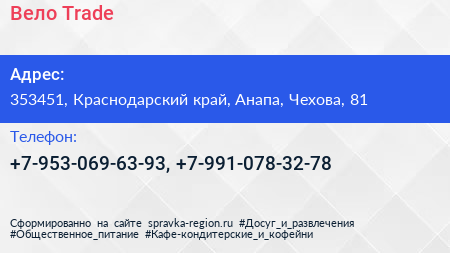 Вело Trade по адресу 353451, Краснодарский край, Анапа, Чехова, 81 в дальнейшем Организация, размещена в следующих категориях: