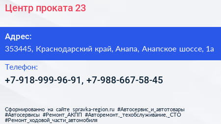 Центр проката 23 по адресу 353445, Краснодарский край, Анапа, Анапское шоссе, 1а в дальнейшем Организация, размещена в следующих категориях: