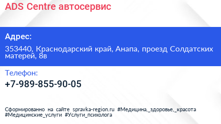 ADS Centre, автосервис по адресу 353440, Краснодарский край, Анапа, проезд Солдатских матерей, 8в в дальнейшем Организация, размещена в следующих категориях: