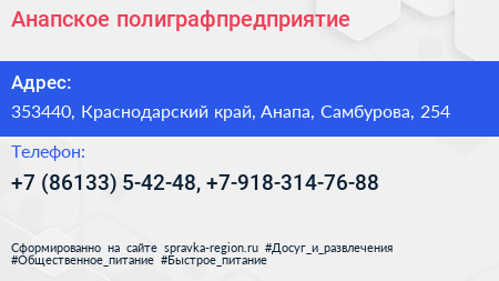 Анапское полиграфпредприятие по адресу 353440, Краснодарский край, Анапа, Самбурова, 254 в дальнейшем Организация, размещена в следующих категориях: