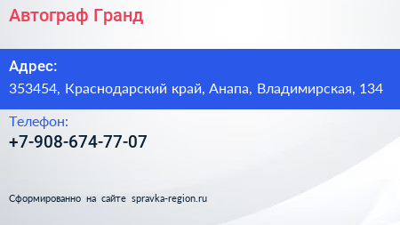 Автограф-Гранд по адресу 353454, Краснодарский край, Анапа, Владимирская, 134 в дальнейшем Организация, размещена в следующих категориях:
