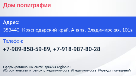 Дом полиграфии по адресу 353440, Краснодарский край, Анапа, Владимирская, 101а в дальнейшем Организация, размещена в следующих категориях: