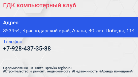 ГДК, компьютерный клуб по адресу 353454, Краснодарский край, Анапа, 40 лет Победы, 114 в дальнейшем Организация, размещена в следующих категориях: