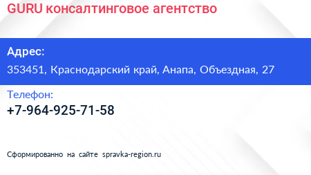 GURU, консалтинговое агентство по адресу 353451, Краснодарский край, Анапа, Объездная, 27 в дальнейшем Организация, размещена в следующих категориях: