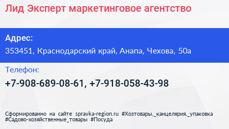 Лид Эксперт, маркетинговое агентство по адресу 353451, Краснодарский край, Анапа, Чехова, 50а в дальнейшем Организация, размещена в следующих категориях: