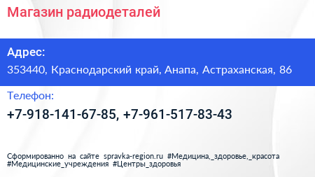 Магазин радиодеталей по адресу 353440, Краснодарский край, Анапа, Астраханская, 86 в дальнейшем Организация, размещена в следующих категориях: