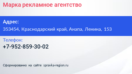 Марка, рекламное агентство по адресу 353454, Краснодарский край, Анапа, Ленина, 153 в дальнейшем Организация, размещена в следующих категориях: