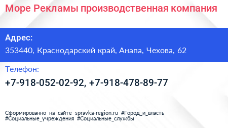 Море Рекламы, производственная компания по адресу 353440, Краснодарский край, Анапа, Чехова, 62 в дальнейшем Организация, размещена в следующих категориях: