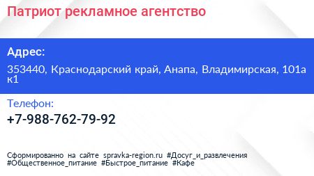 Патриот, рекламное агентство по адресу 353440, Краснодарский край, Анапа, Владимирская, 101а к1 в дальнейшем Организация, размещена в следующих категориях: