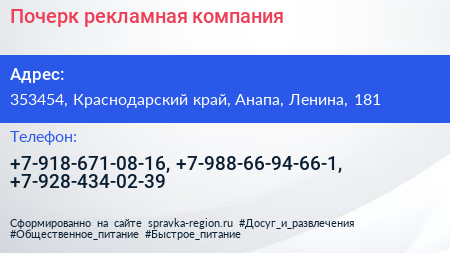 Почерк, рекламная компания по адресу 353454, Краснодарский край, Анапа, Ленина, 181 в дальнейшем Организация, размещена в следующих категориях:
