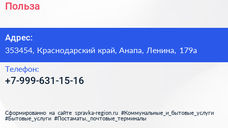Польза по адресу 353454, Краснодарский край, Анапа, Ленина, 179а в дальнейшем Организация, размещена в следующих категориях: