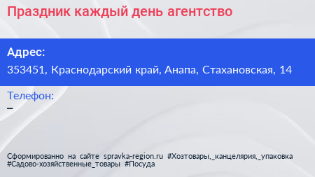Праздник каждый день, агентство по адресу 353451, Краснодарский край, Анапа, Стахановская, 14 в дальнейшем Организация, размещена в следующих категориях:
