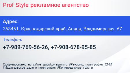 Prof Style, рекламное агентство по адресу 353451, Краснодарский край, Анапа, Владимирская, 67 в дальнейшем Организация, размещена в следующих категориях: