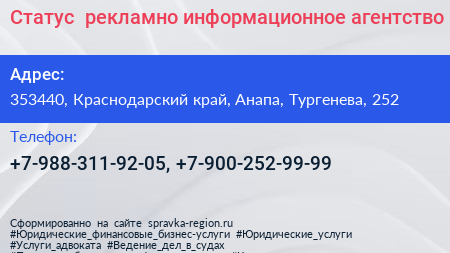 Статус+, рекламно-информационное агентство по адресу 353440, Краснодарский край, Анапа, Тургенева, 252 в дальнейшем Организация, размещена в следующих категориях:
