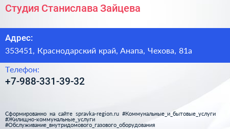 Студия Станислава Зайцева по адресу 353451, Краснодарский край, Анапа, Чехова, 81а в дальнейшем Организация, размещена в следующих категориях: