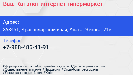 Ваш Каталог, интернет-гипермаркет по адресу 353451, Краснодарский край, Анапа, Чехова, 71в в дальнейшем Организация, размещена в следующих категориях: