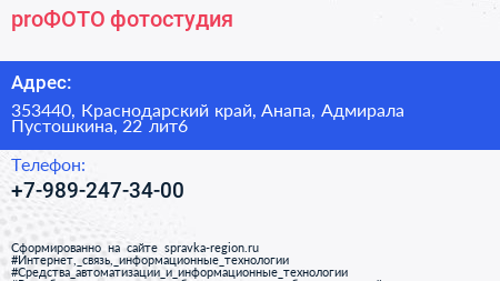 proФОТО, фотостудия по адресу 353440, Краснодарский край, Анапа, Адмирала Пустошкина, 22 лит6 в дальнейшем Организация, размещена в следующих категориях: