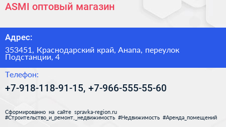 ASMI, оптовый магазин по адресу 353451, Краснодарский край, Анапа, переулок Подстанции, 4 в дальнейшем Организация, размещена в следующих категориях: