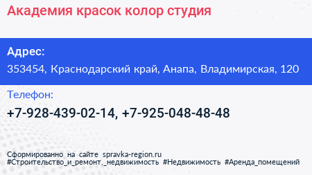 Академия красок, колор-студия по адресу 353454, Краснодарский край, Анапа, Владимирская, 120 в дальнейшем Организация, размещена в следующих категориях: