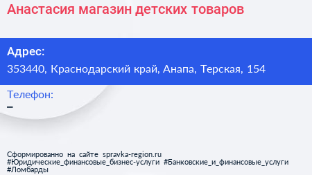 Анастасия, магазин детских товаров по адресу 353440, Краснодарский край, Анапа, Терская, 154 в дальнейшем Организация, размещена в следующих категориях: