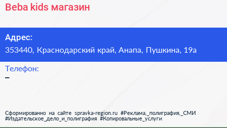 Beba kids, магазин по адресу 353440, Краснодарский край, Анапа, Пушкина, 19а в дальнейшем Организация, размещена в следующих категориях: