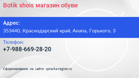Botik shois, магазин обуви по адресу 353440, Краснодарский край, Анапа, Горького, 3 в дальнейшем Организация, размещена в следующих категориях: