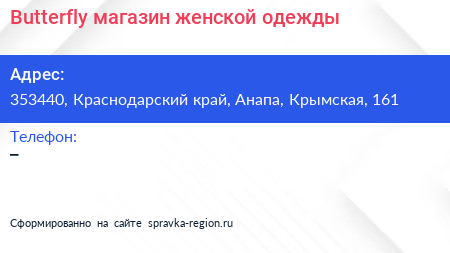 Butterfly, магазин женской одежды по адресу 353440, Краснодарский край, Анапа, Крымская, 161 в дальнейшем Организация, размещена в следующих категориях:
