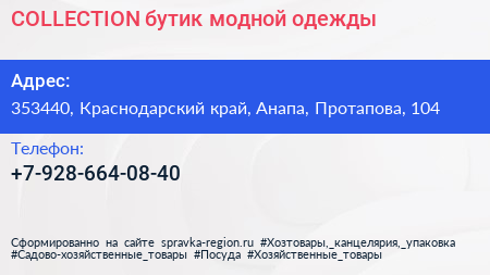 COLLECTION, бутик модной одежды по адресу 353440, Краснодарский край, Анапа, Протапова, 104 в дальнейшем Организация, размещена в следующих категориях: